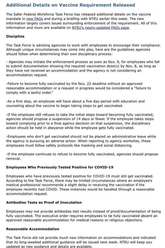 Additionally, on October 1st, NTEU National received further information on possible discipline if employees do not comply with the executive order. Agencies have been advised to work with employees to encourage vaccinations, and released guidelines for disciplinary actions.